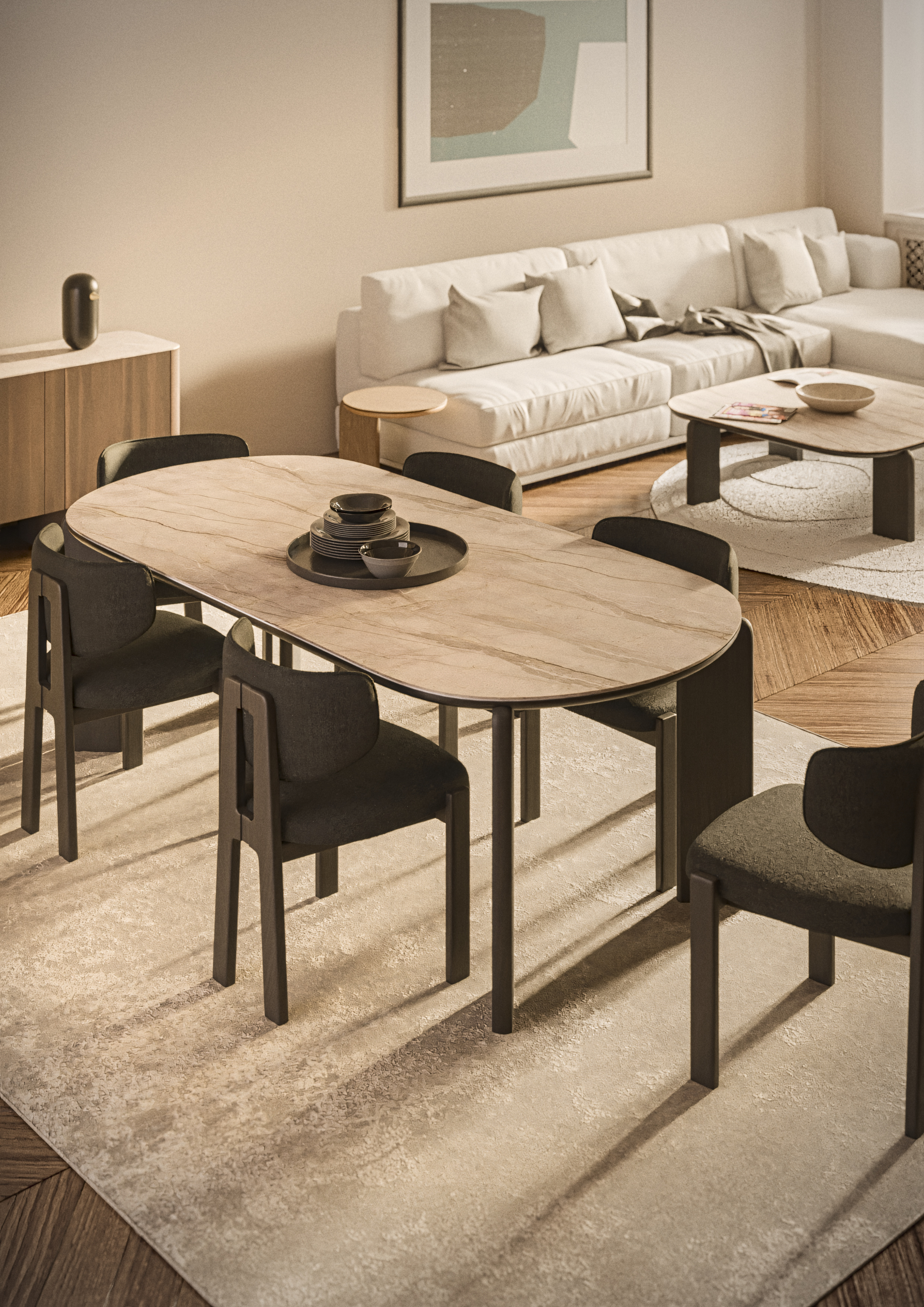 Τραπεζαρία με ιδιαίτερο χαρακτήρα, που ξεχωρίζει για τον σύγχρονο σχεδιασμό και τις απαλές καμπύλες της.