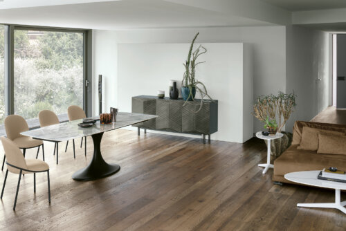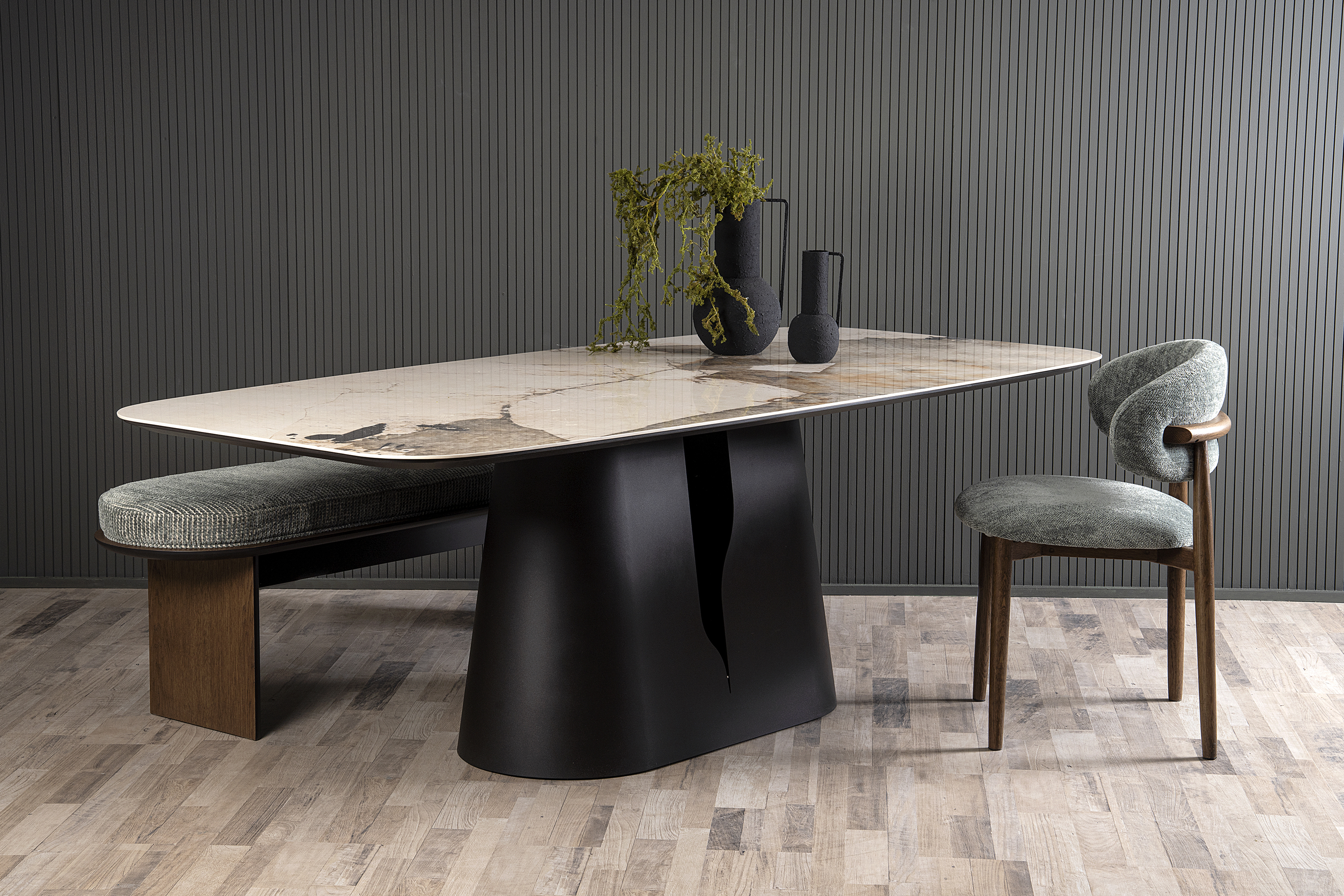 Τραπεζαρία με εντυπωσιακή μεταλλική κεντρική βάση που προσδίδει δυναμικό χαρακτήρα και σύγχρονη αισθητική.