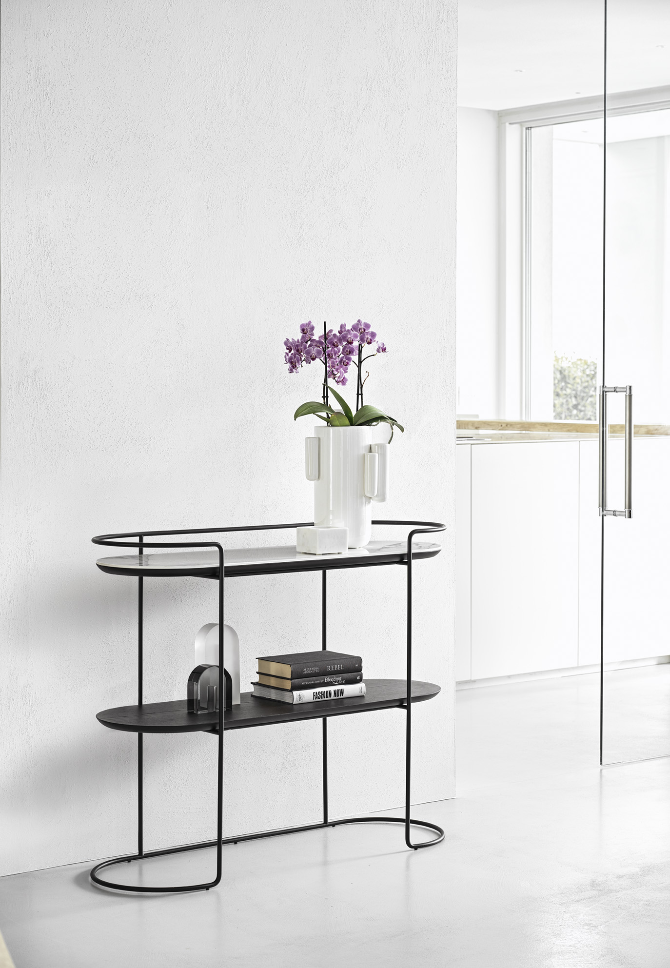 Έπιπλο εισόδου με συνδυασμό ξύλινης και κεραμικής επιφάνειας και μεταλλικό σκελετό ιταλικής εισαγωγής του οίκου calligaris.